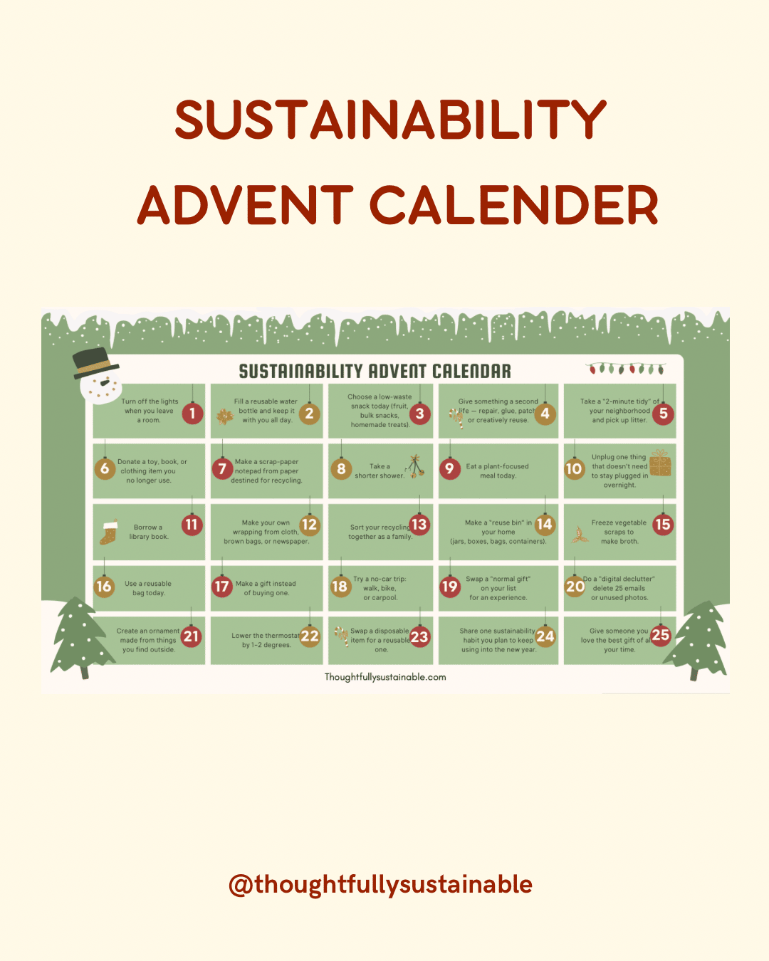 1. A ready-to-use advent calendar featuring 25 kid-friendly sustainability actions—quick, doable ideas to build eco-habits all month long.